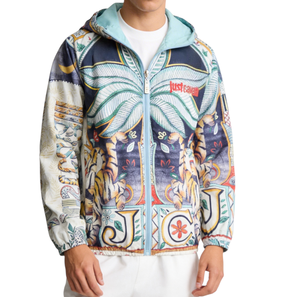 Questo giubbotto primaverile Just Cavalli è un’esplosione di creatività, colore e identità. La stampa jungle multicolore, ricca di foglie tropicali, tigri, farfalle e motivi decorativi, trasforma il capo in un vero pezzo statement, perfetto per l’uomo che ama distinguersi con stile. Il design è armonioso e scenografico, con una composizione grafica che richiama l’energia e l’estetica iconica del brand. Il dettaglio “JOY” sul fondo e il logo Just Cavalli sul petto aggiungono un tocco distintivo e immediatamente riconoscibile.